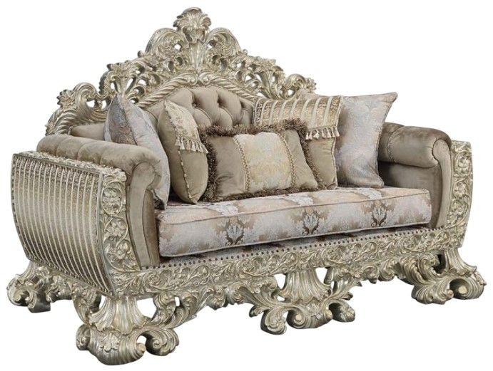 Leave your guests speechless when they enter your living room with the Sorina sofa. The stunning gold outer frame is flawlessly paired with the crystal-like button tufting to create a rich look. The damask upholstered seat cushion perfectly complements this sofa. Elaborate design features are what make up the Sorina collection.Read More