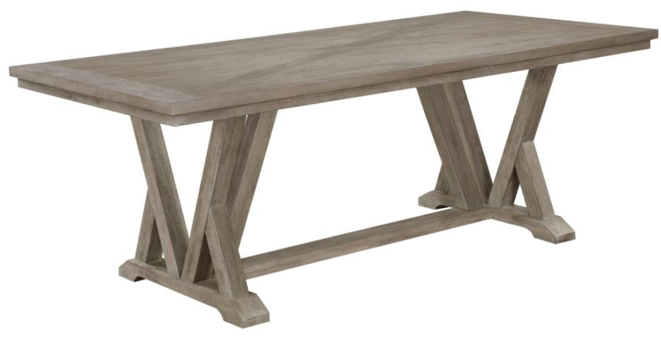 Coastal gray wood grain finish is light and on-trend, perfect for casual family dining spaces