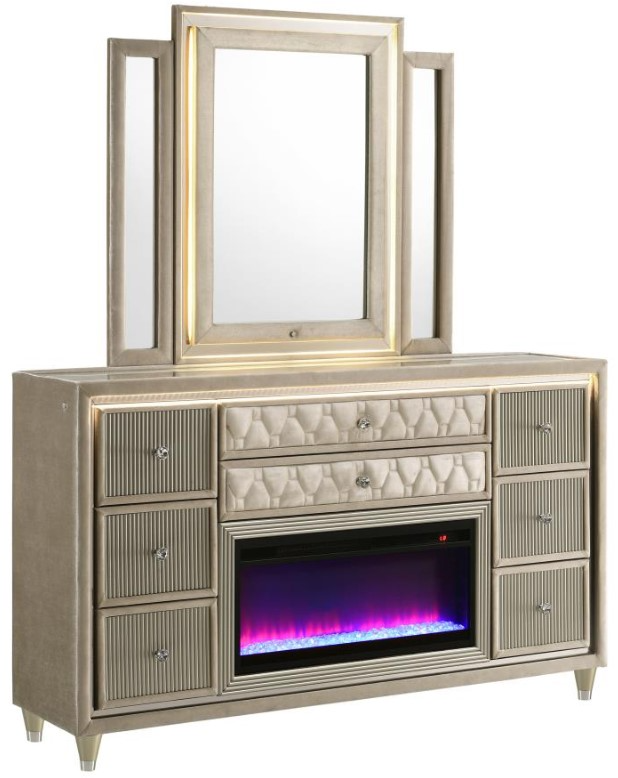 Warmth meets radiance in this dresser and mirror set, where ivory and camel velvet surround every surface. A built-in flame visualizer sits beneath a clear Tempered glass top, with LED case lighting adding atmosphere. The tri-panel mirror features LED illumination to complete the glow.Read More