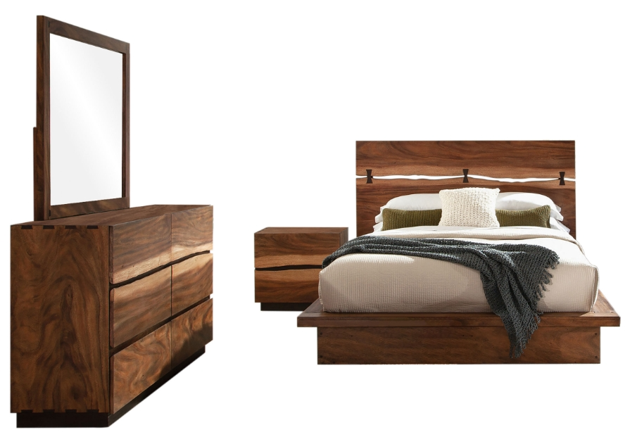 Add an exotic addition to your master suite with this rustic bedroom set. Crafted from a full-tree slab, you will love variations of wood grains and hues in each piece. The platform bed offers a simplistic silhouette with a tall headboard while your mattress sits on a wide base.Read More