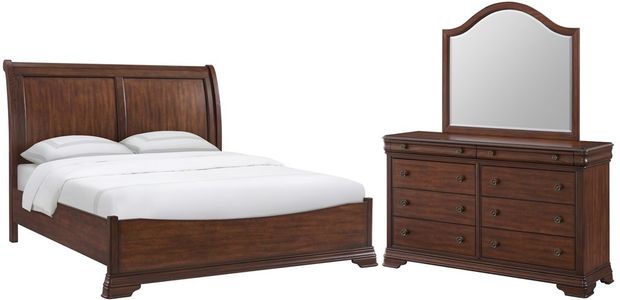 The Phillipe Bedroom Set is the epitome of elegance and sophistication. With its sleek sleigh headboard, stained drawer panels, and curved mirror, these pieces will add a touch of luxury to any bedroom.Read More