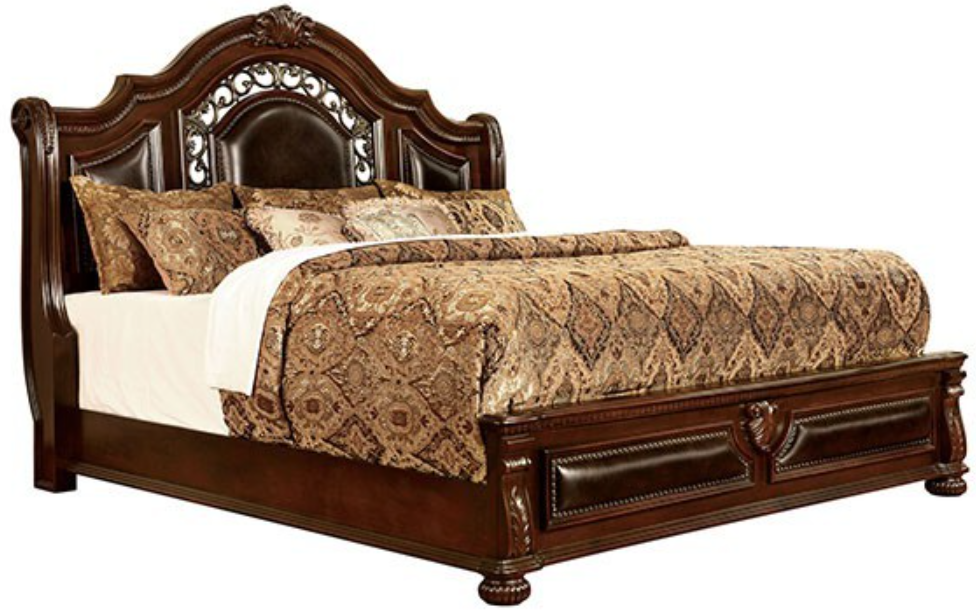 Add a traditional spin to your bedroom with this stunning collection! With all the qualities of classic designs, this bedroom set will be a hit with its bold accents and smooth brown cherry finish. Perfectly placed nailhead trim along the leatherette panels create a visual complement to the swirling antique gold metal detailing.Read More