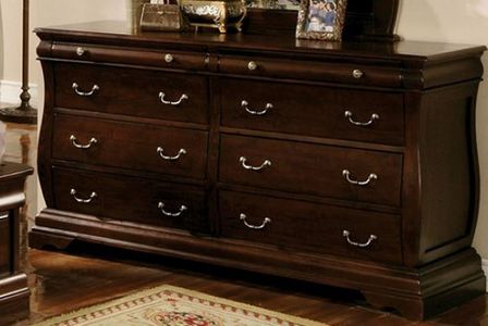 Dresser with pull handles and eight drawers. Finished in a deep brown cherry with antique hardware, this set is the perfect combination of looks and utility.