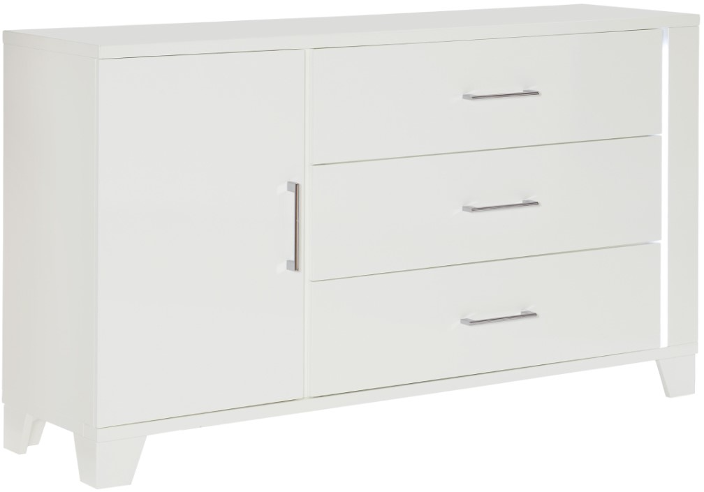 The visually stunning Kerren Collection is a modern study on line and light. LED enhances the front side of each case piece and top rail of the bed. The door dresser provides ample space for storage alongside the nightstand and chest.Read More