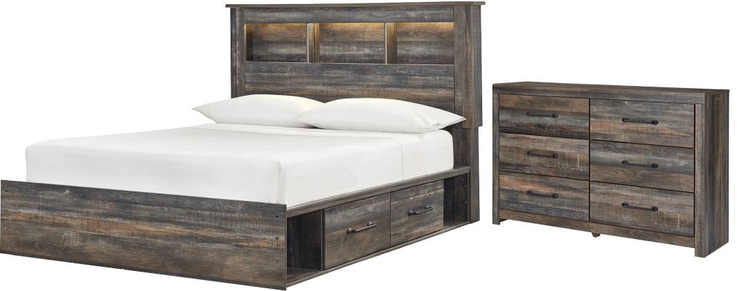 Includes king-size bookcase bed with storage (bookcase headboard, footboard, under bed storage unit, rails and wood roll slats) and 6-drawer dresser